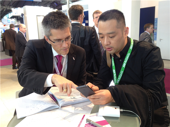 图为姜晓东副总裁与赢创美诗工业生产线负责人菲利普博士洽谈