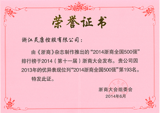 图为公司荣获的“2014浙商全国500强”证书